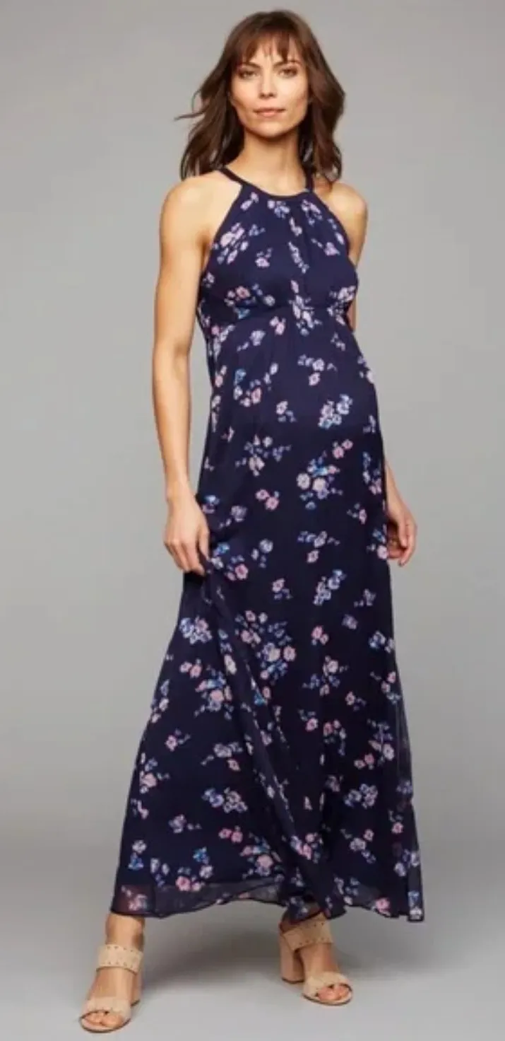 A PEA IN THE POD | Navy Blue Floral Chiffon Halter Maxi Dress Floaty Navy Blue Floral Print Crinkle Chiffon Gathered Halter Neckline Flared Ruffle Hem Empire Waist, Bump Friendly Zip Closure Fully lined Maxi Length Excellent condition - no flaws - feels brand new! Floral Maxi, Maternity Dress, Cocktail Dress, Wedding Guest Dress, Maxi Dress, Boho, Bohemian