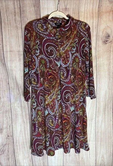 Look stylish and elegant in this beautiful MSK women's swing dress. The dress features a stunning paisley pattern with long sleeves and a collared neckline. It is made of a lightweight and stretchy polyester-spandex fabric which makes it comfortable to wear. The dress has a pullover closure and a zip which makes it easy to wear and take off. This knee-length blouson dress is perfect for any occasion whether it's a party, cocktail, casual or business. It is easy to care for and should be hand washed only. This dress is available in size XL and is suitable for all seasons. Add this stunning dress to your wardrobe to elevate your style. No flaws. Reminds me of the 70s Length:35 inches Chest: 21 inches