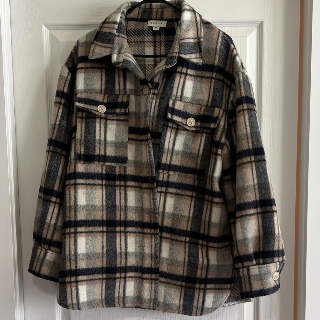 Gently used Evereve plaid oversize shacket Plaid pattern with navy and tan and white Simone shacket style Minor piling Heavy material Size medium An easy-to-love layer, this plaid shacket by EVEREVE is crafted in soft brushed fabric and features a button-front silhouette with a collared neckline and chest flap pockets. The relaxed fit is perfect for pairing with any fall look from jeans to wide leg pants. Vuitton front with two front slip pockets and two breast pockets Neckline : Point Collar Material: 100% Polyester Shell; Lining: 55% Polyester, 45% Viscose Care: Dry Clean Only Open to reasonable offers