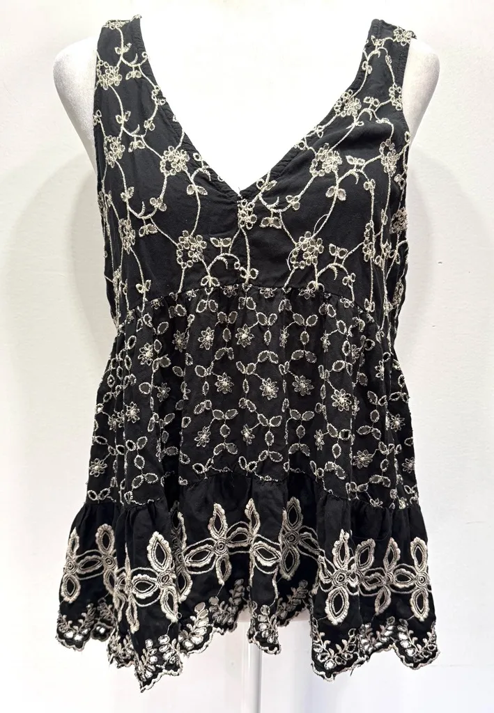 American Eagle Outfitters AEO Black and Beige Eyelet Babydoll Tank Top. Floral cutouts. Scalloped he... Show more