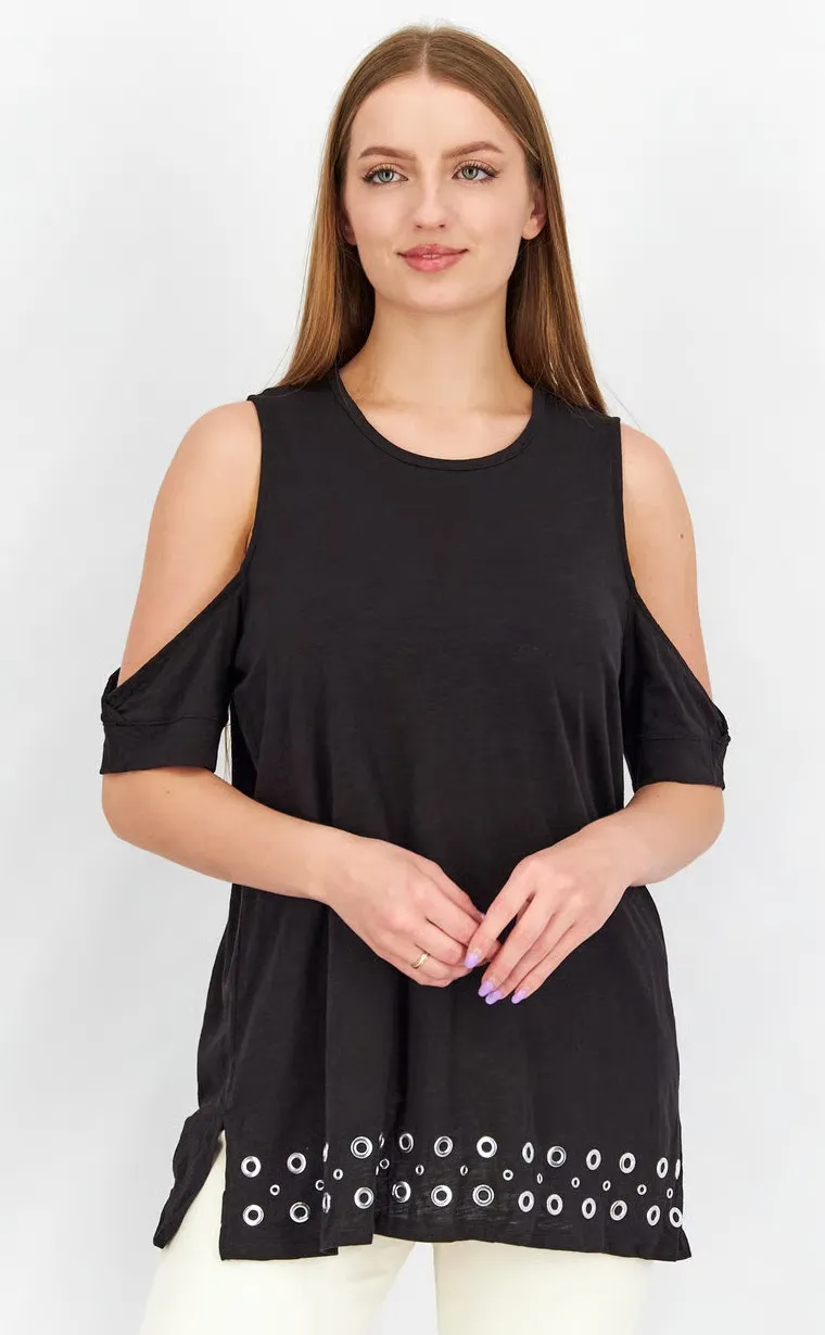 Michael Kors Silver Grommet Black Cold Shoulder Shirt Size Women's Medium • Round Silver Grommet De... Show more