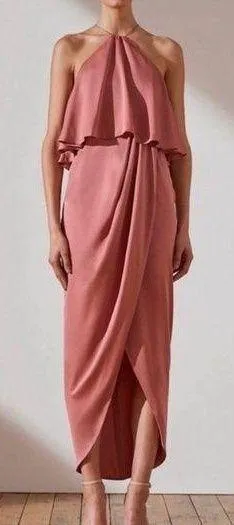 Shona Joy Luxe Halter Frill Tulip Hem Cocktail Dress in Rosé new with tags. Size 4. - Luxe halter frill dress in a light weight woven fabric with a silk touch. - Halter neck - Tie at back neck - Flounce bodice overlay - Invisible back zipper - Cross over draped surplice skirt - Fully lined - 100% Polyester Measurements - Armpit to armpit: 16” across - Waist: 13.5” across - Hip (12” down from waist seam): 17” across - Length: 54” from top of halter - Midi to Maxi length depending on height. **This does have a run in the fabric on top left but because of the way the fabric drapes, it’s not really noticeable. See last photo* Open to reasonable offers Tags: wedding guest bridesmaid formal cocktail party event pink rose ruffle bow black tie satin chiffon slip silk