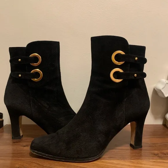 Chantal vintage Italian black suede leather m booties, black and gold accents, side zipper. No box, Matching suede wrap heels. Made in Italy. Leather soles, stunning soft suede boots, heeled, perfect for tall and winter, has general wear gold hardware, smoke pets free environment, fast shipping. Color may vary by device screen and light