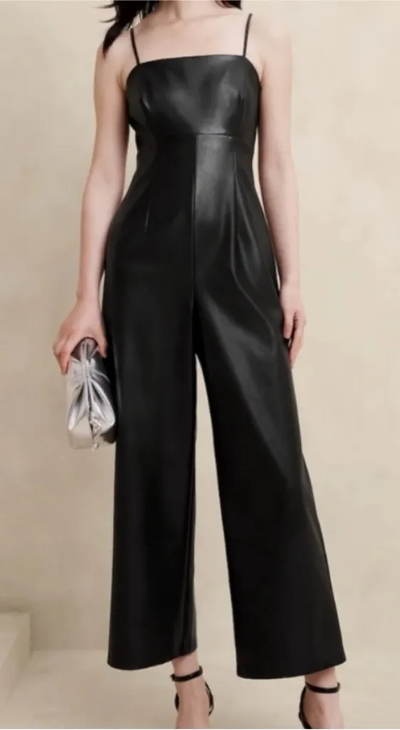 Banana Republic Faux Leather Jumpsuit Black Size 10 Side zipper Wide legs Adjuatable straps A bo... Show more