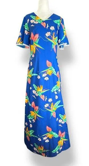 Vintage 70s Made In Hawaii dress Vibrant royal blue base with tropical floral and bird of paradise print Short flutter sleeves with white lace trim V neckline Maxi length Back zipper closure Hidden right pocket Unlined 100% polyester Tagged Size 10 fit is small Vintage 1970s Hawaiian Resort Maxi Tropical Floral Vacay Cruise Summer Luau Perfect for vacations tropical getaways or a relaxed summer party look