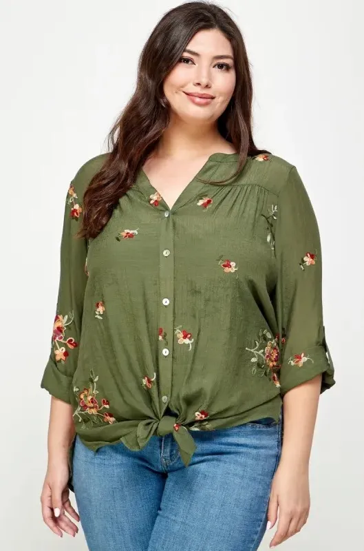 Good used condition embroidered floral pattern, mother-of-pearl buttons, and roll-tab sleeves