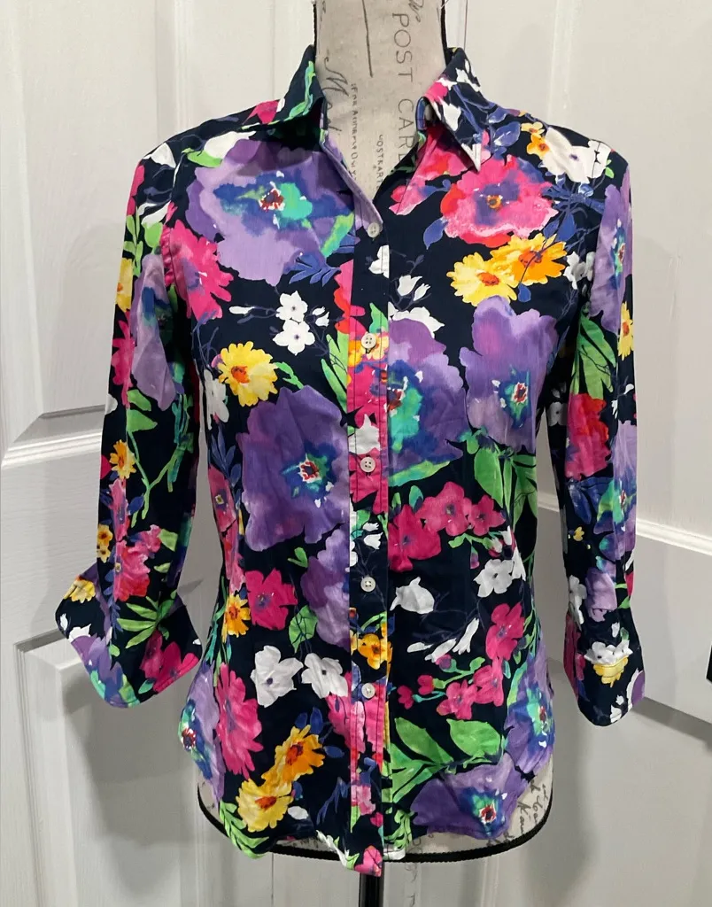 LAUREN RALPH LAUREN 3/4 SLEEVE BUTTON FRONT SHIRT TOP BLOUSE NAVY FLORAL Size undefined - $38 - From Millers