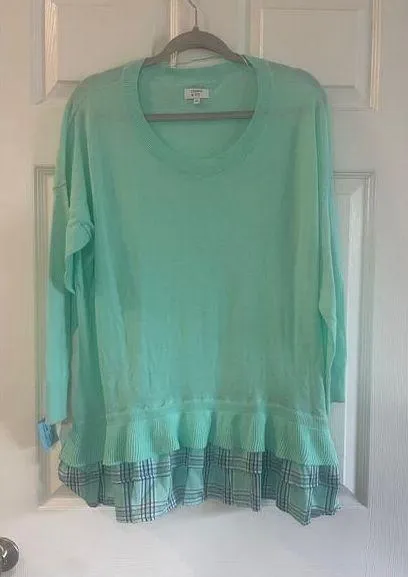 Crown & Ivy Size Large Thin Knit 3/4 Sleeve Shirttail Tiered Ruffle Sweater. Added plaid ruffle in... Show more