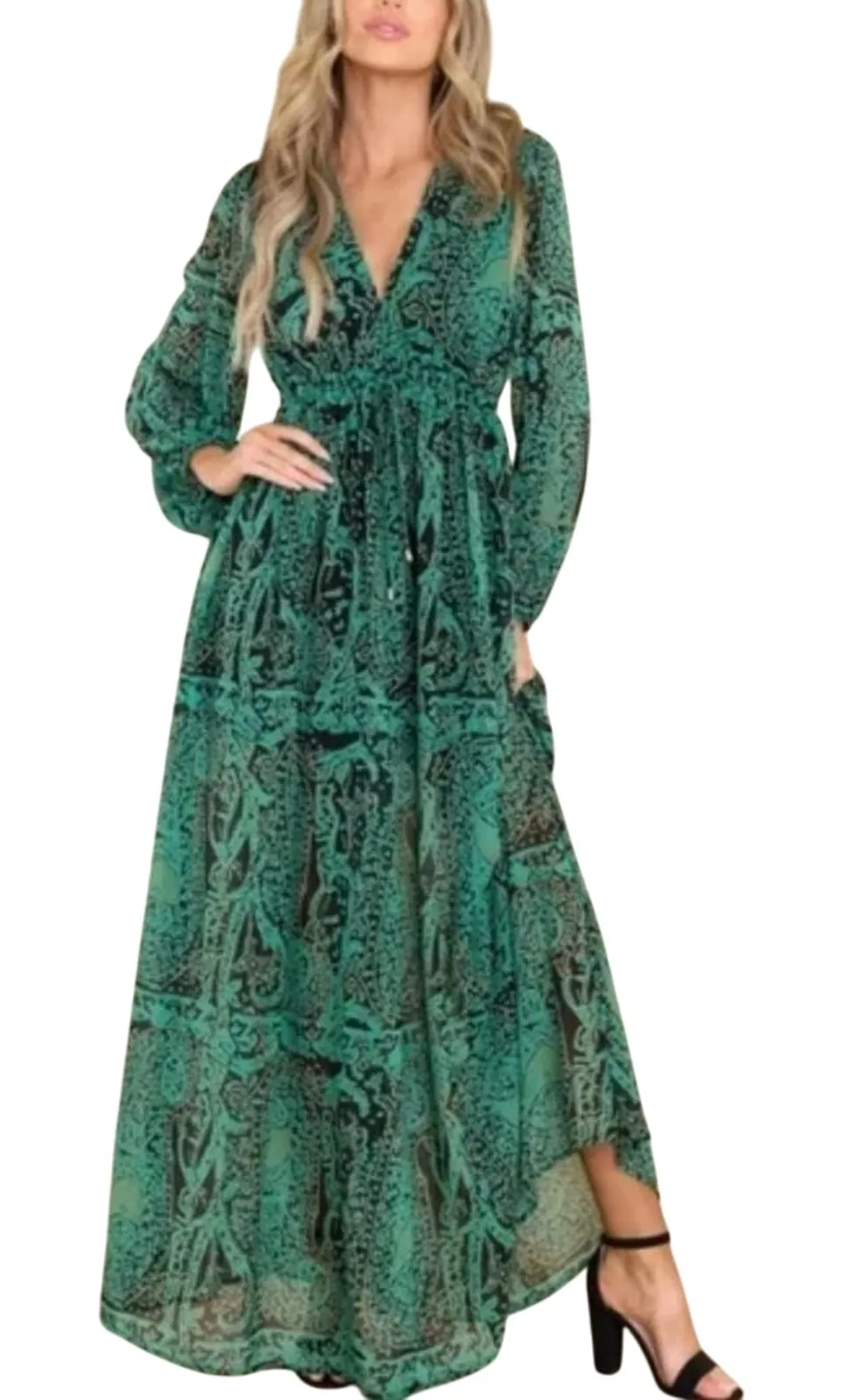 Aakka Magical Maiden Long Sleeve V-Neck Maxi Dress Size Small New without Tag This maxi dress features a v-neckline, fitted waistline, open back, and wild pattern. Pair this colorful maxi dress with boots for a bold look! Our "Magical Maiden Maxi" is perfect for those days you plan to standout! 100% Polyester Hand Wash Cold, Dry Flat Waist Tie Long Sleeves Maxi Length Flowy Body Front Drawstring Tie Not Lined Fit: This dress is true to size with an overall relaxed fit. Length: The length measures 58" to 60" which hits around the ankles. Bust: The bust is relaxed. Waist: The waist is relaxed. Hips: The hips are relaxed. Undergarments: This dress is undergarment friendly. Fabric: The fabric is slightly sheer with no stretch.