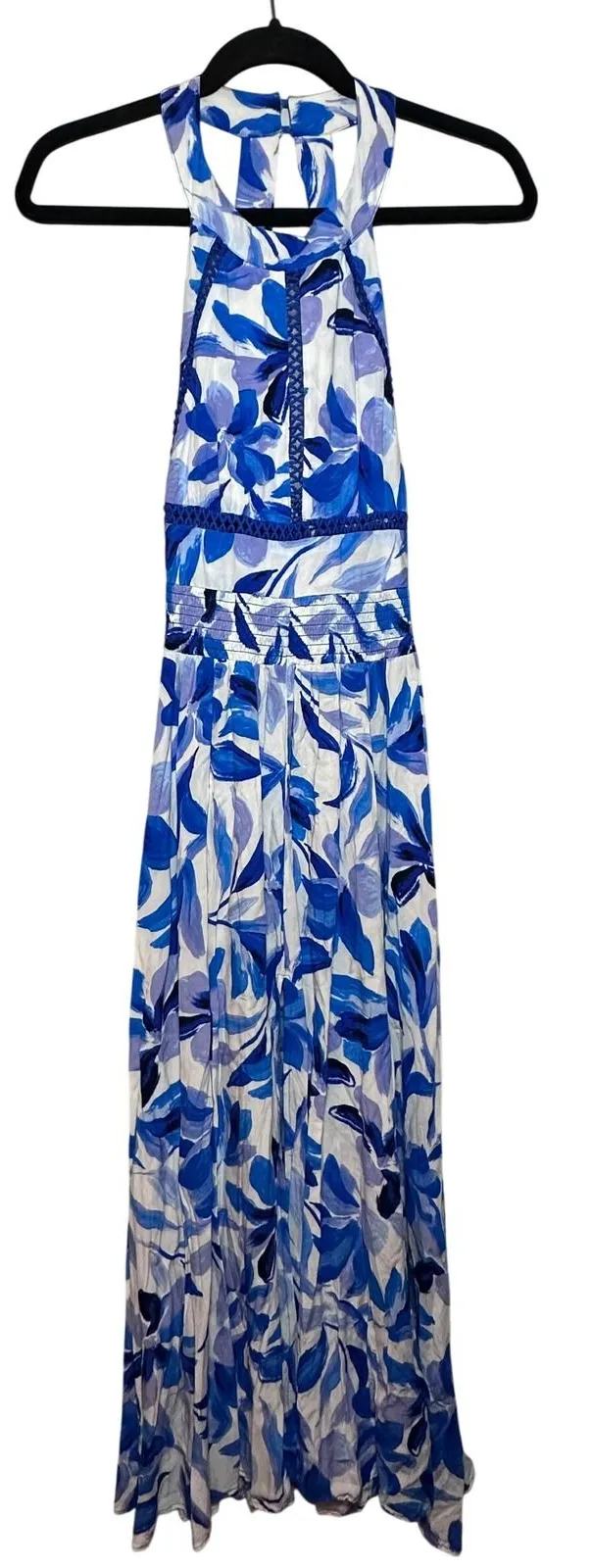 Abel The Label maxi dress in a vibrant blue and white floral print. Features a flattering halter neckline with delicate cutout detailing and decorative trim. The bodice is shirred and smocked for a comfortable and adjustable fit, leading to a flowing tiered skirt. Perfect for a beach vacation, a summer wedding guest, or a stylish resort getaway. Style: Maxi, Sundress Dress Length: Long Department: Women Sleeve Length: Sleeveless Pattern: Floral Occasion: Casual, Party/Cocktail Material: Rayon Fabric Type: Rayon Neckline: Halter Season: Summer, Spring Unit Type: Unit Keywords: halter dress, maxi skirt, smocked bodice, floral print, blue and white, summer dress, vacation wear, resort wear, bohemian, feminine, tiered skirt, cutout detail, halter neck