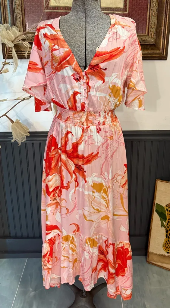 Floaty, feminine, and perfect for warm weather days. This Abel The Label midi features a stunning painterly floral print in shades of coral, blush pink, and golden peach. A flattering elastic waist creates a comfortable shape, while the flutter sleeves and soft pleated skirt add movement and charm. Dress it up with wedges or keep it relaxed with sandals — the perfect resort-to-everyday piece. • V-neckline • Bold watercolor floral print • Flutter short sleeves • Comfortable elastic waistband Size: Small Condition: Excellent pre-owned — no noted flaws Occasion: Brunch • Resort • Vacation • Spring weddings • Day to night Measurements are approximate and from laying flat: Chest: 16” Waist unstretched: 11” Length: 46” resort wear, feminine, boho chic, spring dress, tropical floral, vacation outfit, brunch style, garden party, pink and coral dress, flutter sleeve, elastic waist, summer wedding guest, vacation dress, beach dinner outfit, cruise