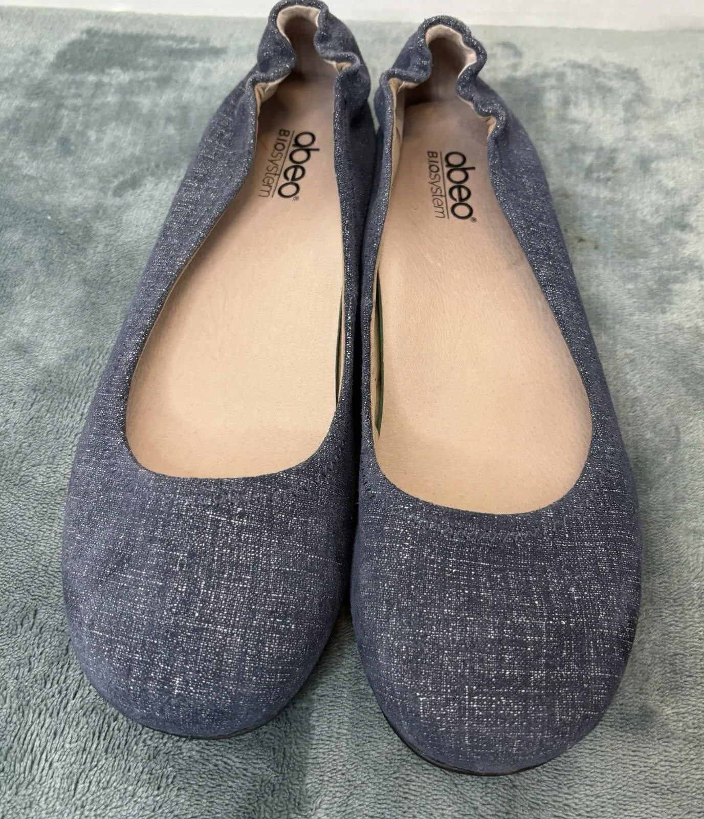 The Abeo B.I.O.Systems® TAMMY Women's Orthotic Navy Flats in size 9 are stylish and comfortable slip-on flats perfect for casual occasions. With a denim fabric lining and cushioned insole, these flats provide both support and comfort. The rubber outsole offers durability, making them suitable for summer and fall seasons. The classic blue color and elegant design make these flats a chic addition to any wardrobe, blending a touch of designer style with a casual look.