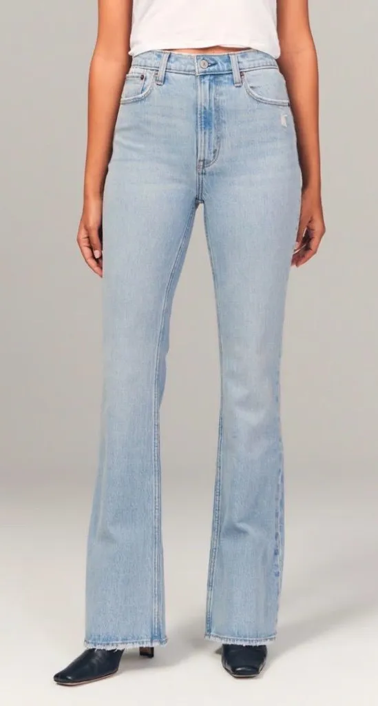 Chic light blue flare jeans. Perfect for a stylish look. Small spot on the leg shown in the picture.