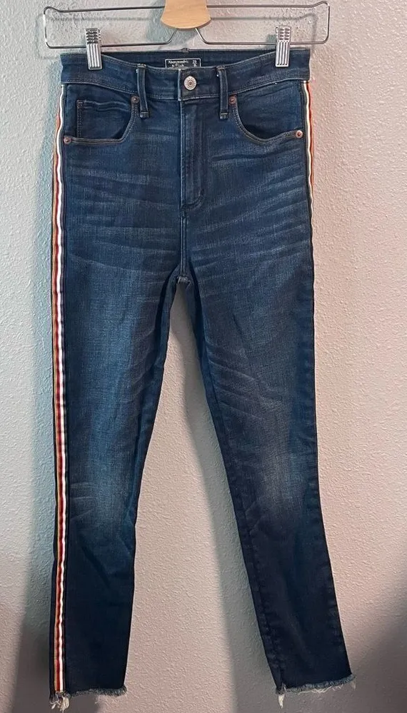 10” rise. 26.5” inseam. Deep blue wash, colored stripe down each outseam. Raw hem. Very gently use... Show more