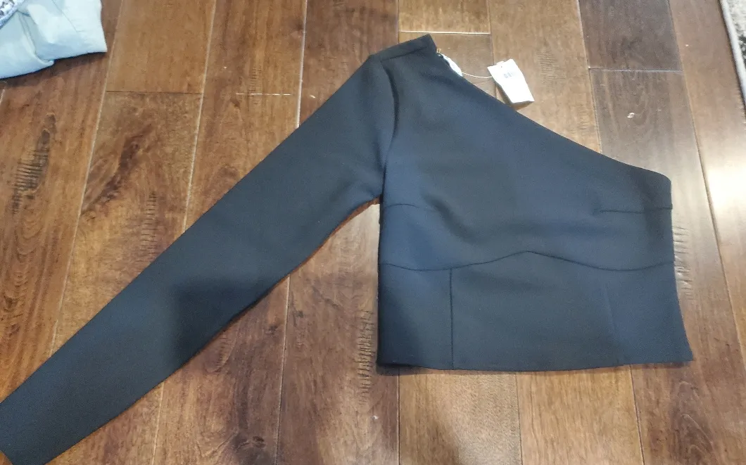 Stylish one-shoulder black top. Perfect for a chic look. 10-11-24