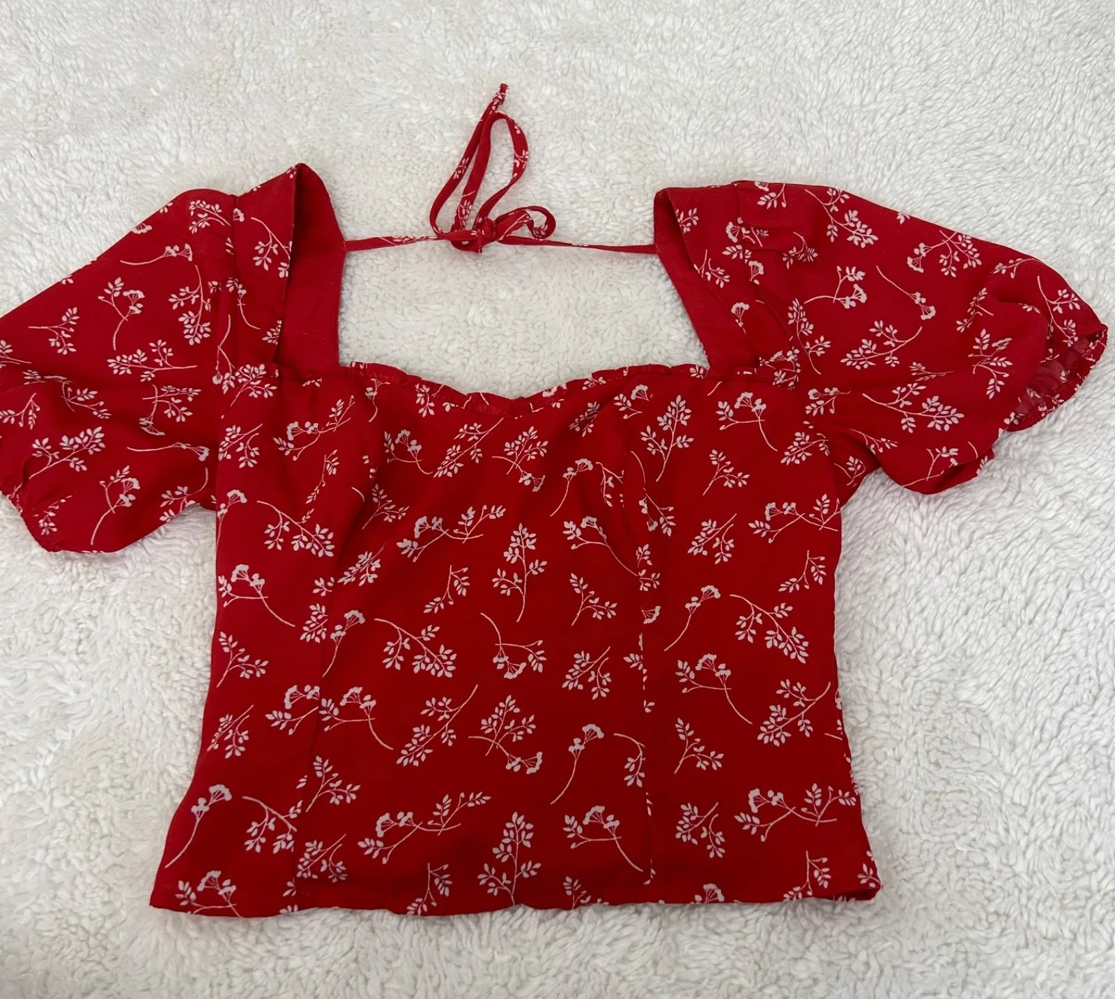 This Abercrombie & Fitch crop top in XS features a red floral design, short puff sleeves, and a swee... Show more