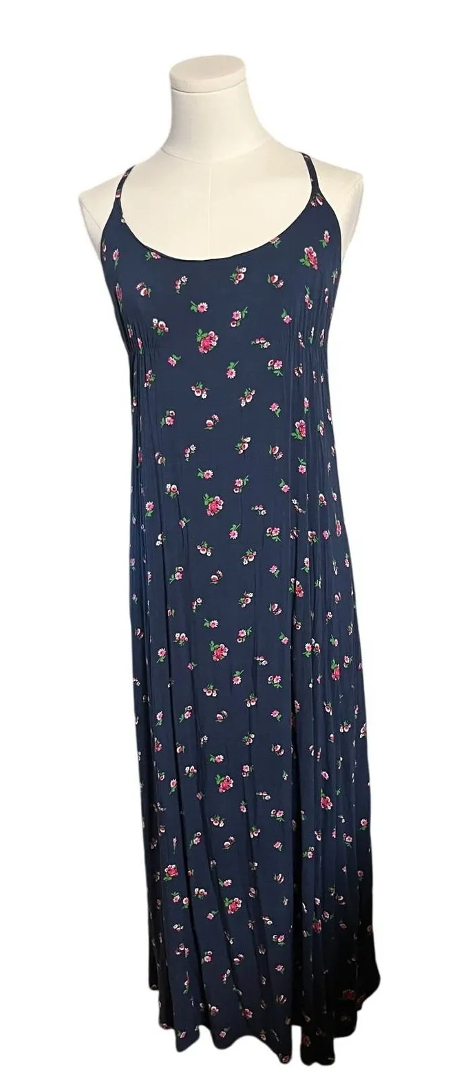 Flowy Abercrombie & Fitch maxi dress in navy blue with a delicate allover floral print. Lightweight... Show more