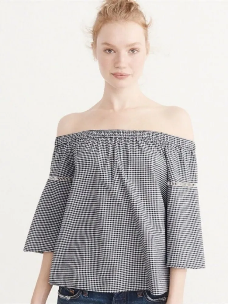 Abercrombie & Fitch Off the Shoulder Gingham Plaid Top Black and white Cute lace cutout detail on s... Show more