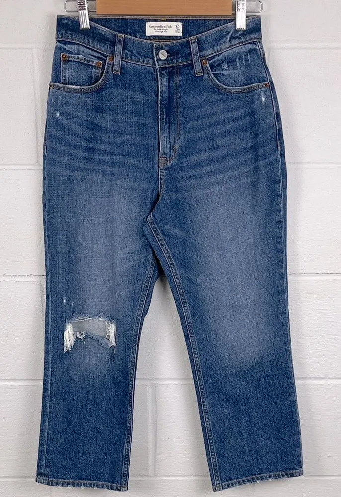 Abercrombie & Fitch women’s curve love the ankle straight ultra high rise medium wash jean Distresse... Show more