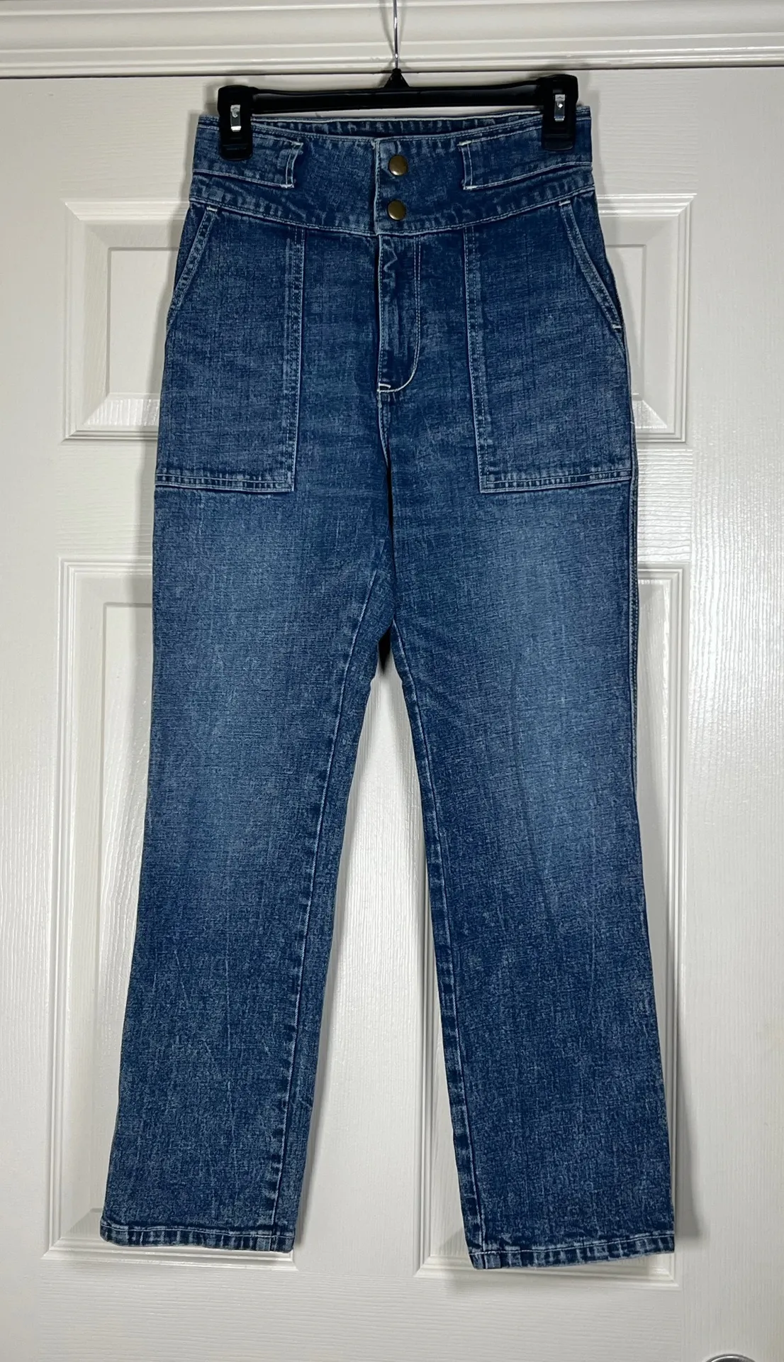 The product is a pair of Abercrombie & Fitch Women's Ultra High Rise Straight Leg Medium Wash Jeans... Show more