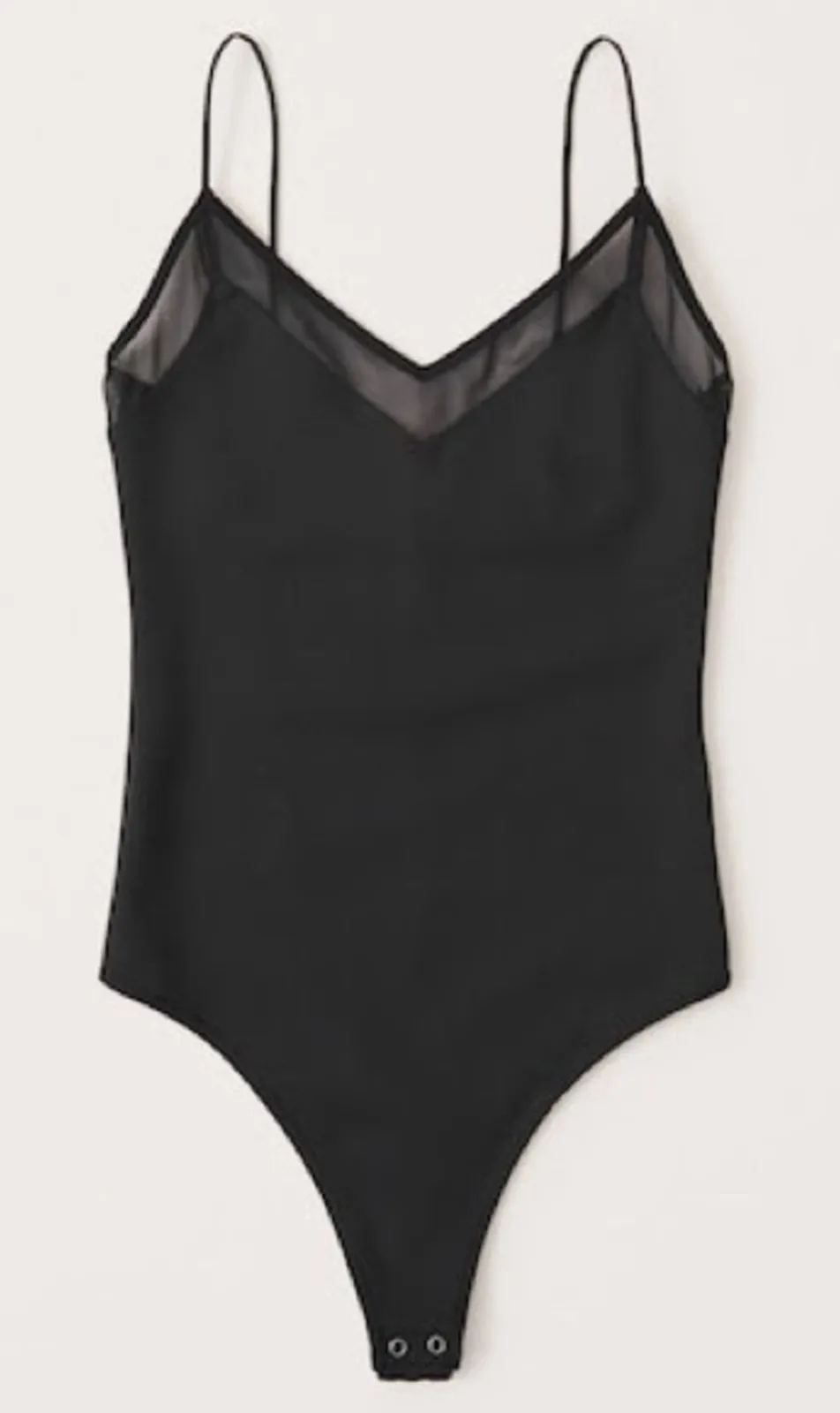 Slim-fitting bodysuit from A&F with mesh detail at v-neckline, cami spaghetti straps and two-snap bo... Show more