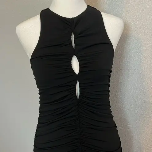 Size small Black Ruched and stretchy 3 keyholes from chest to above waist High neck Fully lined 33”... Show more