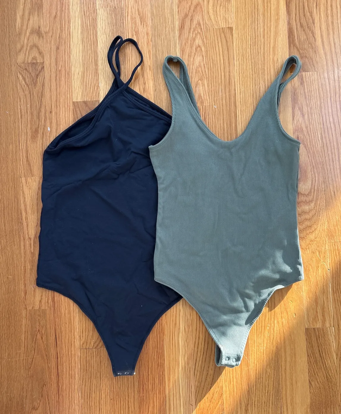 Set of two Abercrombie Fitch tank bodysuits in a ribbed knit fabric. One is olive green and the othe... Show more
