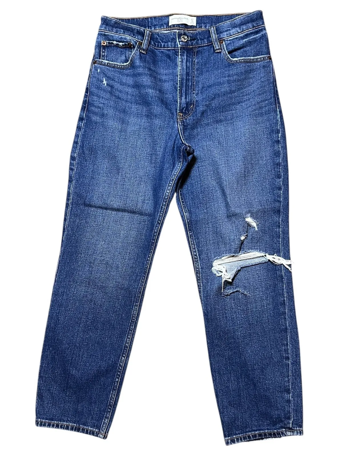 Keywords: Abercrombie Fitch, Mom jeans, High rise, Distressed denim, Blue jeans, Women's denim, Casual wear, Streetwear, Comfortable jeans, Everyday style, Modern fit, Straight leg