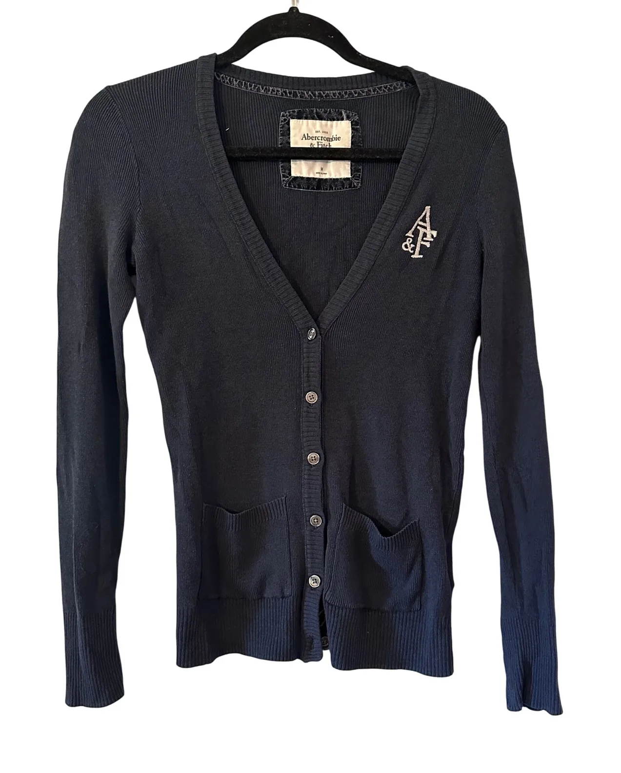 A classic navy blue ribbed button-front cardigan sweater. This stylish knit features a V-neckline, long sleeves, and two front pockets, adorned with a subtle embroidered Abercrombie & Fitch logo on the chest. The ribbed texture adds a touch of visual interest and comfortable stretch. Perfect for layering over a camisole or tee for a casual outing, a day at the office, or a relaxed evening. Size M. No stains or holes. Minor wash wear.