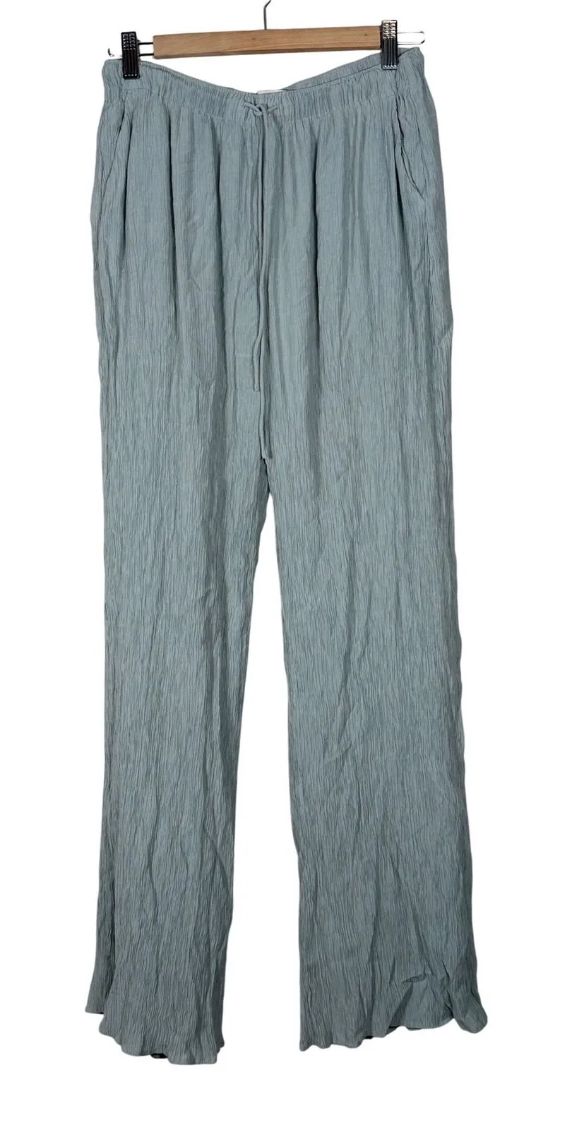Abercrombie Fitch women's light blue crinkle wide leg pants. Elastic waistband with a functional dra... Show more