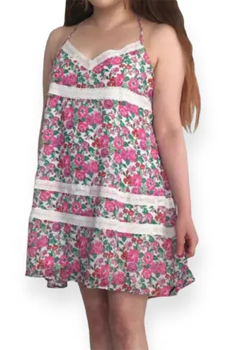 Sweet and lightweight floral sundress featuring pink and green blooms with delicate white lace trim... Show more