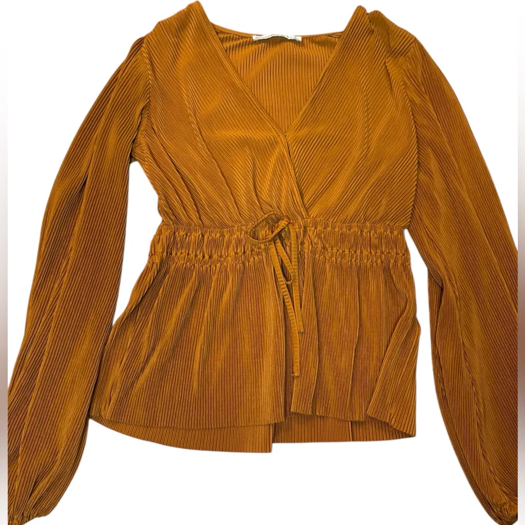 • Gorgeous rich, rust colored v neck blouse top in pleated fabric with adjustable tie waist detail