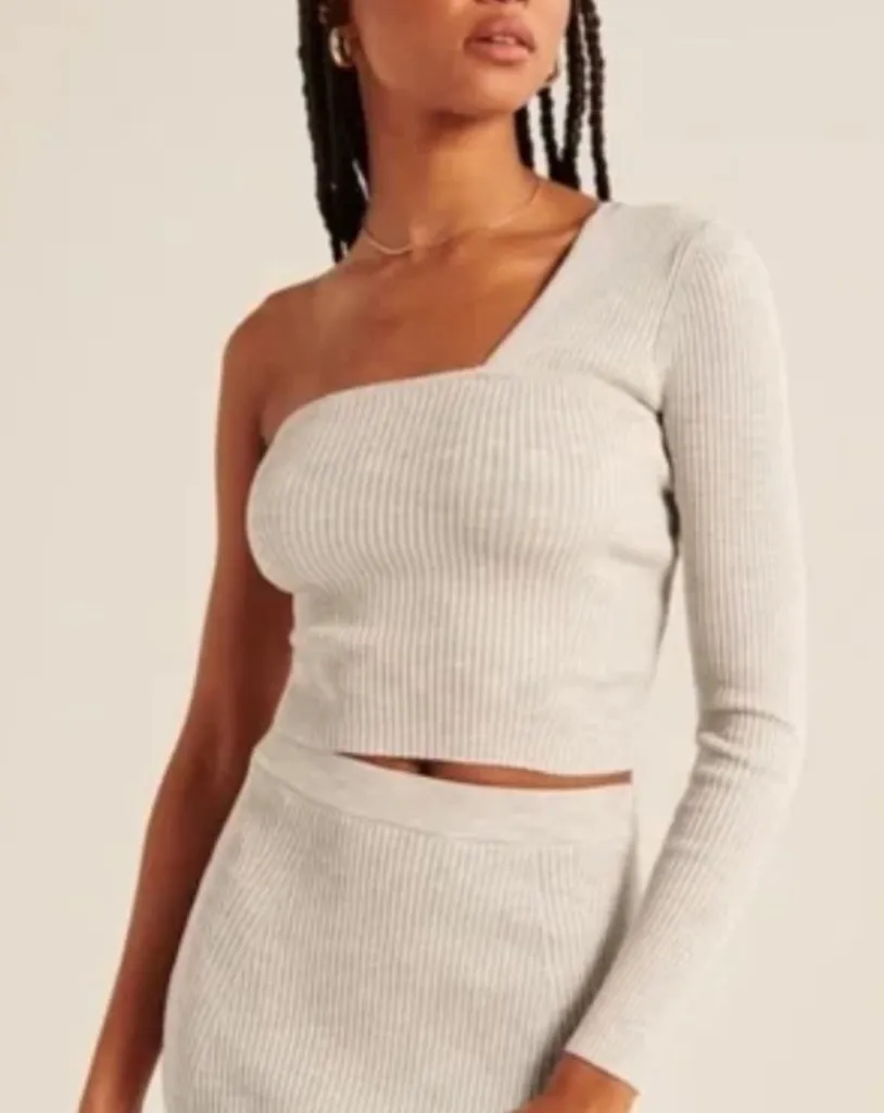 • Ribbed knit asymmetrical top with one long sleeve and one exposed shoulder detailing in a cream /... Show more