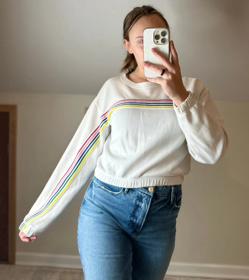 Elevate your wardrobe with this vibrant Abercrombie rainbow striped cropped sweatshirt! Perfect for... Show more