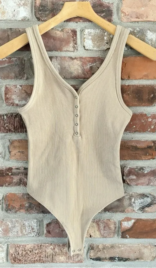 Abercrombie Tan Ribbed Henley Sleeveless Bodysuit Size extra small. Stretch knit. 13” pit to pit, 2... Show more