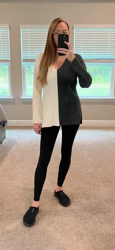 Elegant V-neck sweater with a striking black and cream contrast. Ideal for versatile styling. Tried... Show more