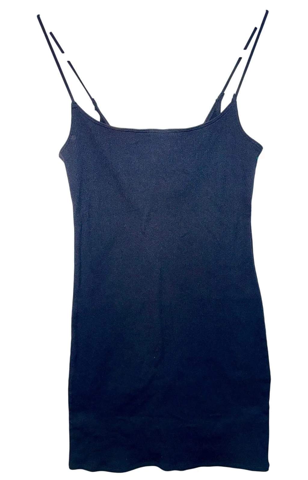 Abercrombie & Fitch ribbed knit mini dress in a classic black colorway. Designed with a flattering scoop neckline and thin spaghetti straps, this fitted silhouette offers comfortable stretch and an easy pull-on style. Soft ribbed knit fabric creates a sleek, body-hugging look perfect for casual wear, layering, or dressing up for a night out. Previously store displayed with minor wear consistent with handling.