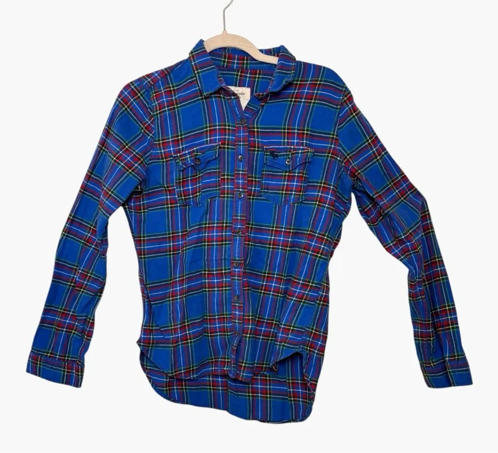 Classic Abercrombie & Fitch plaid button-down shirt in a vibrant blue colorway with red, green, and... Show more