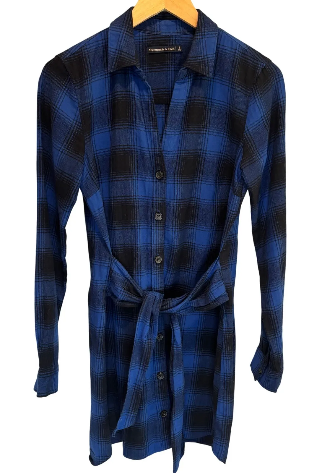 Blue and black plaid print. Button front. Long sleeves with buttoned cuffs. Attached matching tie at... Show more