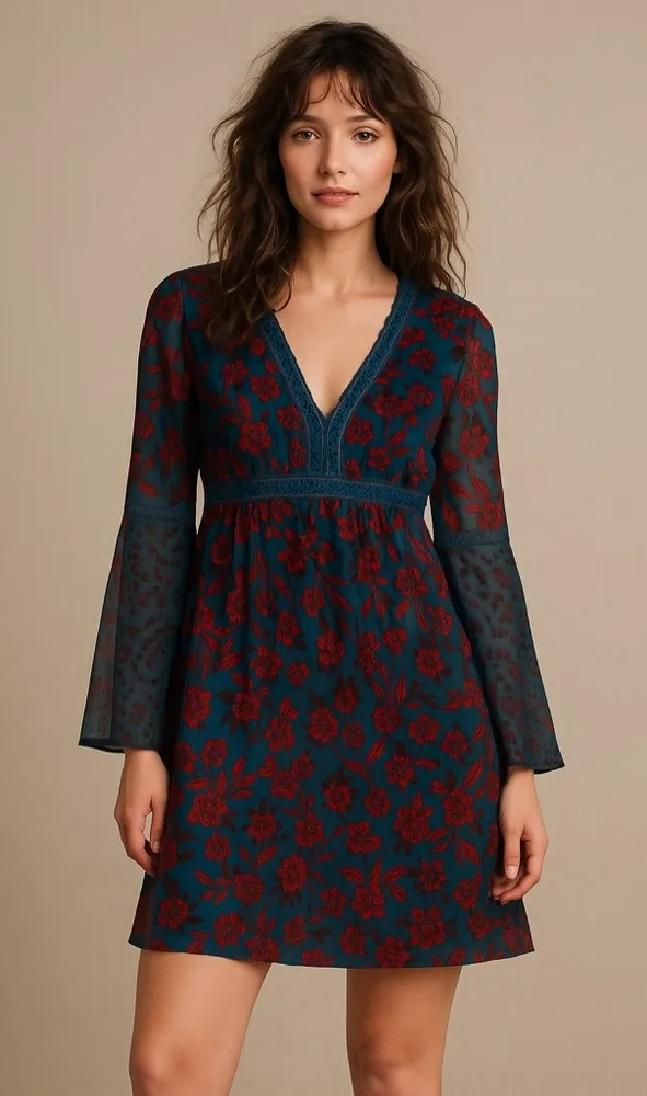 Romantic and dreamy Abercrombie & Fitch mini dress in deep teal with bell sleeves and a rich red dar... Show more