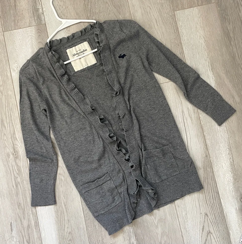 Abercrombie & Fitch Ruffle Open Cardigan Sweater in the color Gray. Open front, ruffle detailing alo... Show more