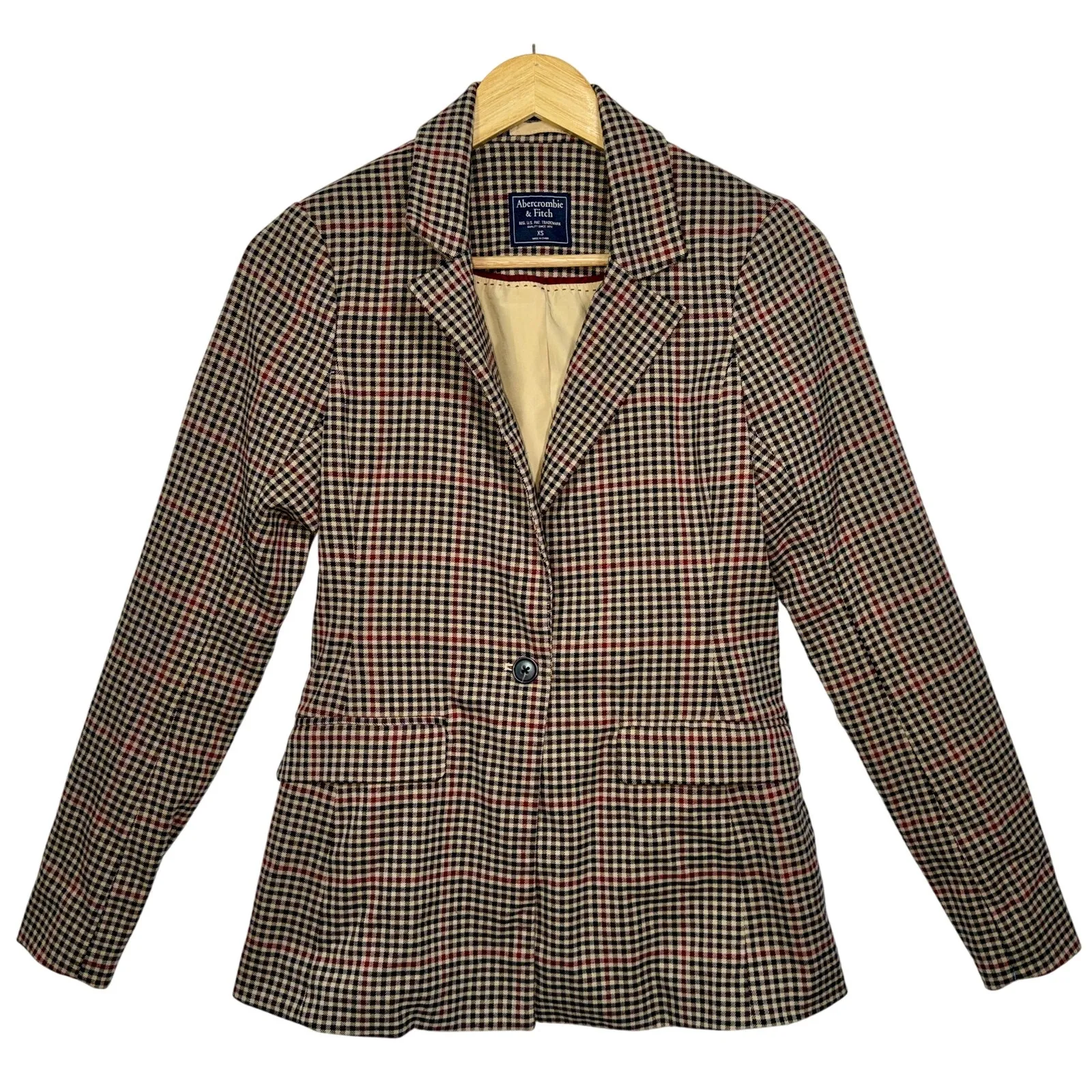 Abercrombie & Fitch Cream Brown Black Red Gold Checkered Plaid Blazer Jacket Coat Womens Size XS (Extra Small)