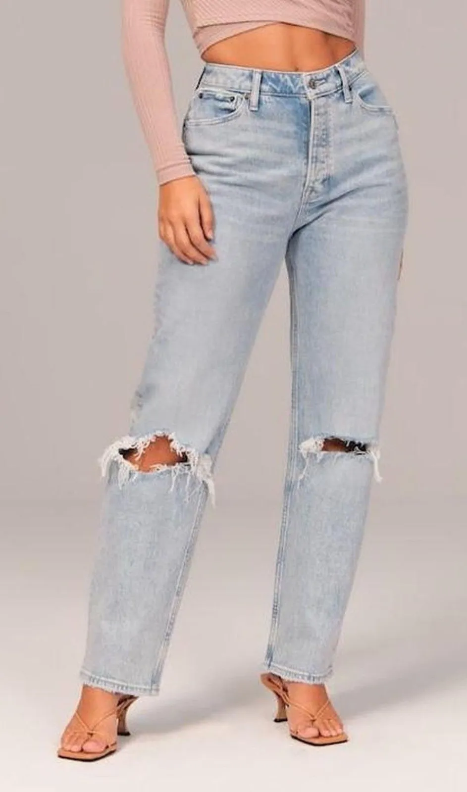 Light wash, acid wash distressed denim High rise Straight "dad" fit Curve love style Hidden button... Show more