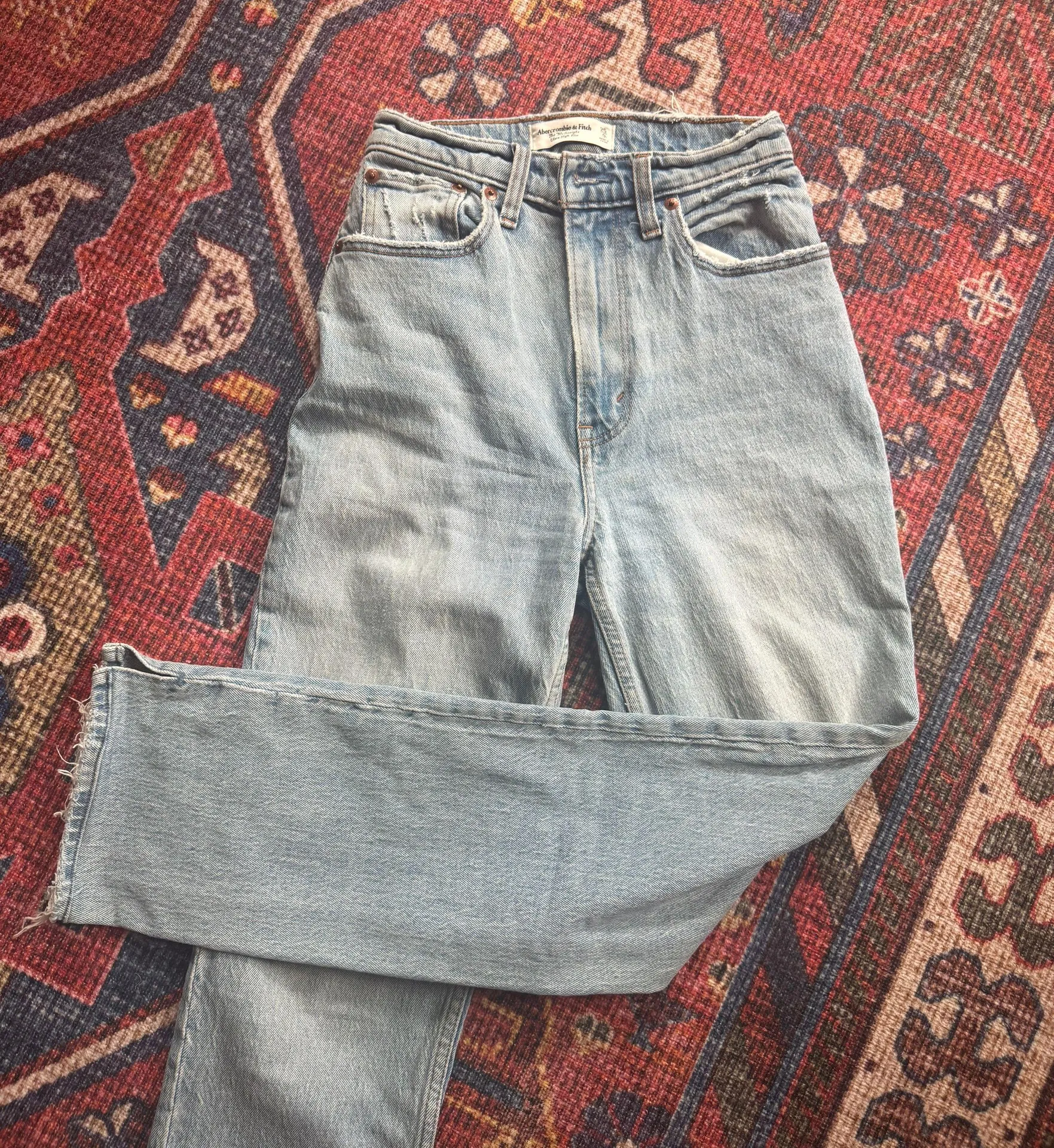 A&F straight leg jeans with slit at the bottom. Size 25 (size 0). Fits true to size. Worn only a han... Show more