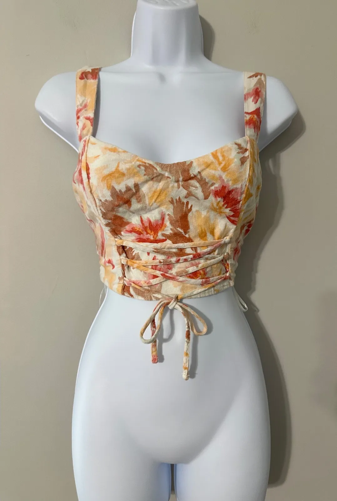Keywords: Abercrombie Fitch, Floral Crop Top, Linen Blend Top, Corset Top, Smocked Back, Lace Up Detail, Summer Fashion, Vacation Wear, Beach Outfit, Boho Style, Women's Top, Size Small, Cropped Blouse, Festival Wear, Trendy Top