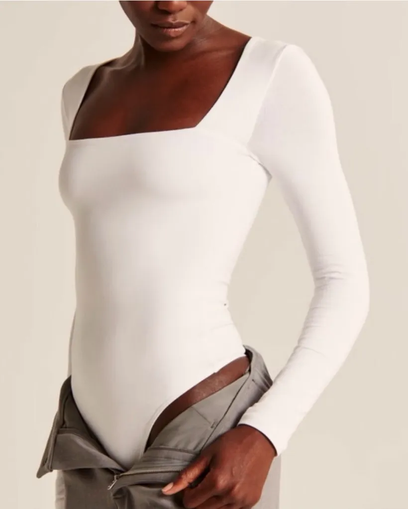 Good condition, no flaws. Chic white bodysuit with long sleeves. Square neckline adds elegance. Idea... Show more