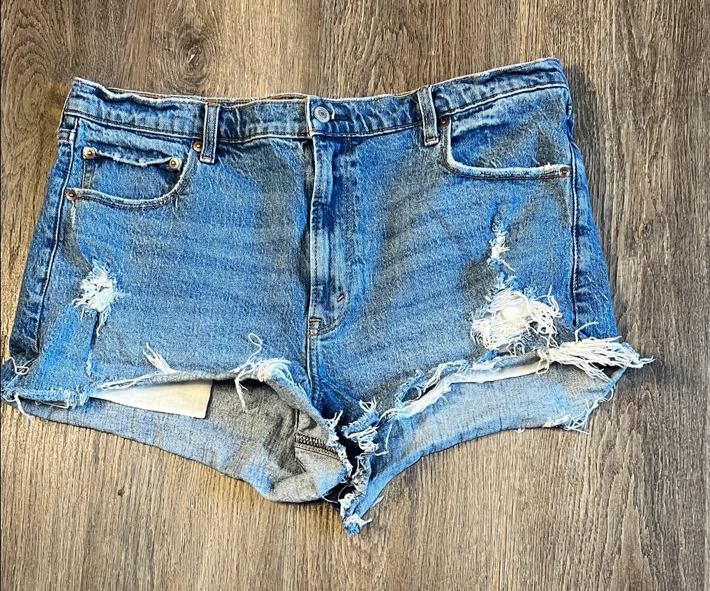 Trendy ripped jean shorts with a classic blue wash. Perfect for casual wear. Excellent preowned cond... Show more