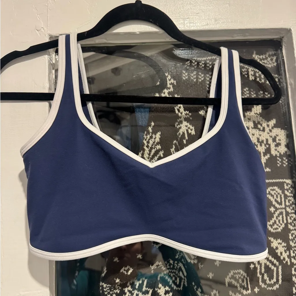 Stylish navy sports bra with white accents. Ideal for active wear.
