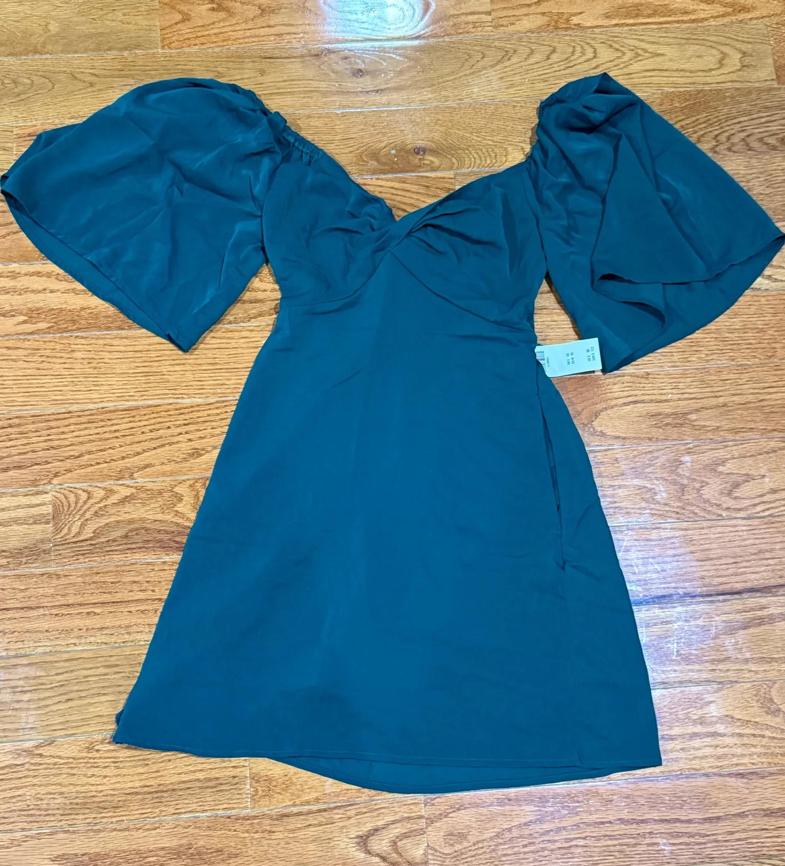 Very elegant teal flowy sleeve dress. It has built in shorts underneath, and an open back that ties.... Show more