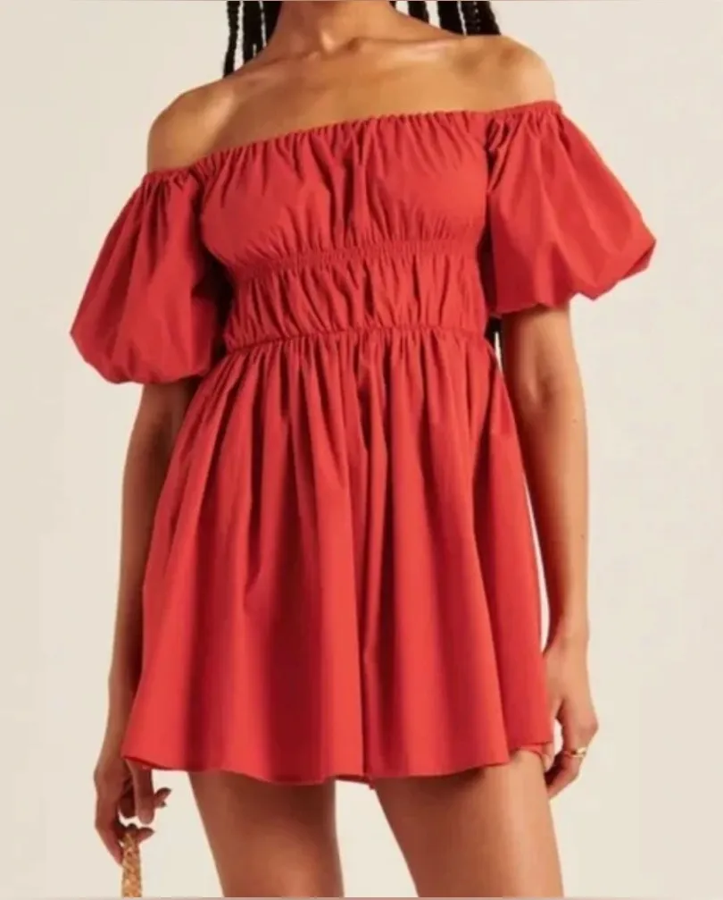 Flattering short-sleeve mini dress in a soft poplin fabric, featuring off-the-shoulder detail, on-tr... Show more